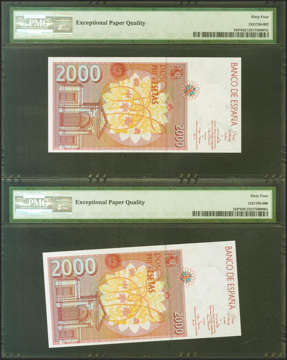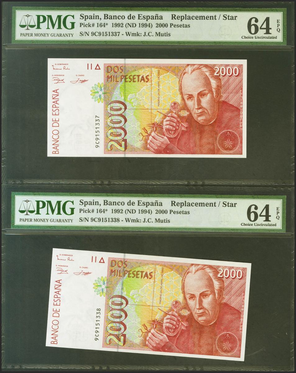 2000 Pesetas. 24 de Abril de 1992. Pareja correlativa. Serie especial 9C. (Edifil 2021: 482Ab, Pick: 164*). Inusual, apresto original. SC. Encapsulados PMG64EPQ, ambos.