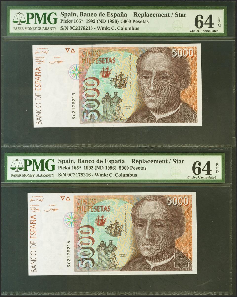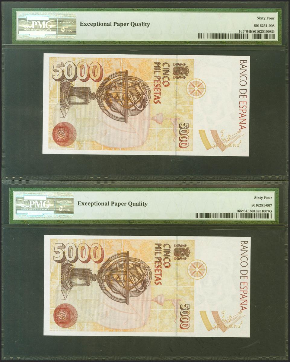 5000 Pesetas. 12 de Octubre de 1992. Pareja correlativa. Serie especial 9C. (Edifil 2021: 484b, Pick: 165*). SC. Encapsulados PMG64EPQ, ambos.