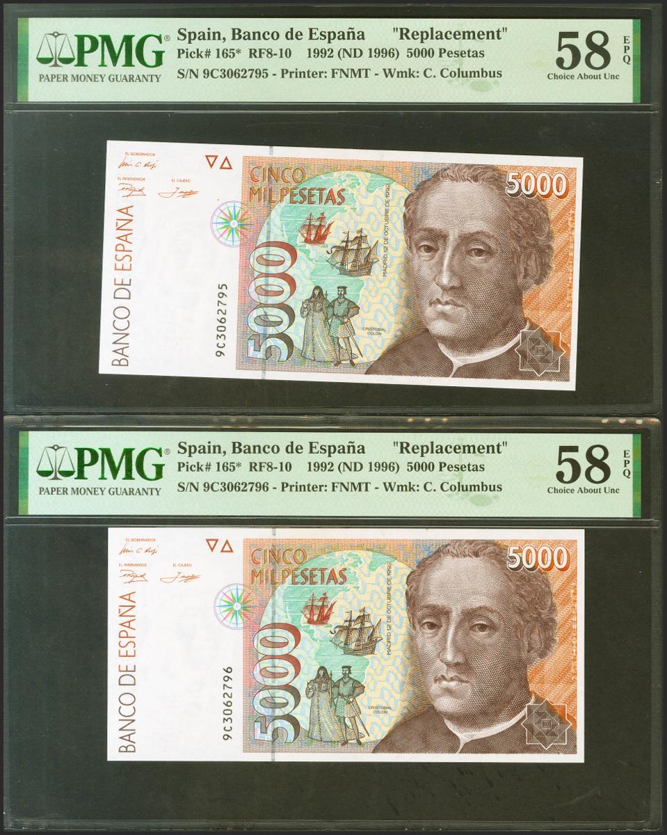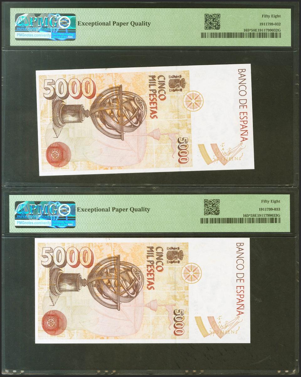 5000 Pesetas. 12 de Octubre de 1992. Pareja correlativa. Serie especial 9C. (Edifil 2021: 484b, Pick: 165*). Inusual en esta excepcional calidad, apresto original. EBC+++. Encapsulados PMG58EPQ, ambos.