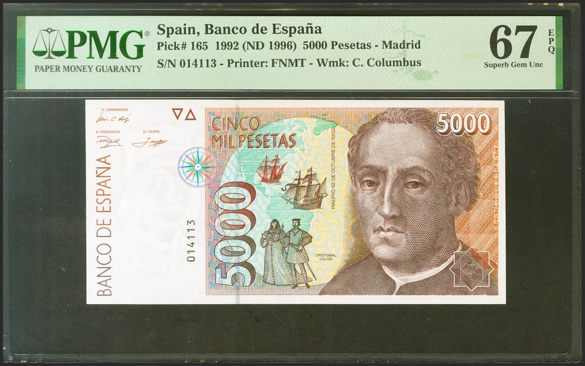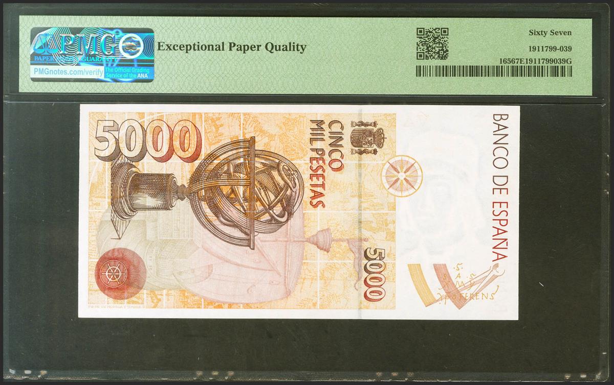 5000 Pesetas. 12 de Octubre de 1992. Sin serie. (Edifil 2021: 484, Pick: 165). Muy raro en esta excepcional calidad, apresto original. SC. Encapsulado PMG67EPQ.