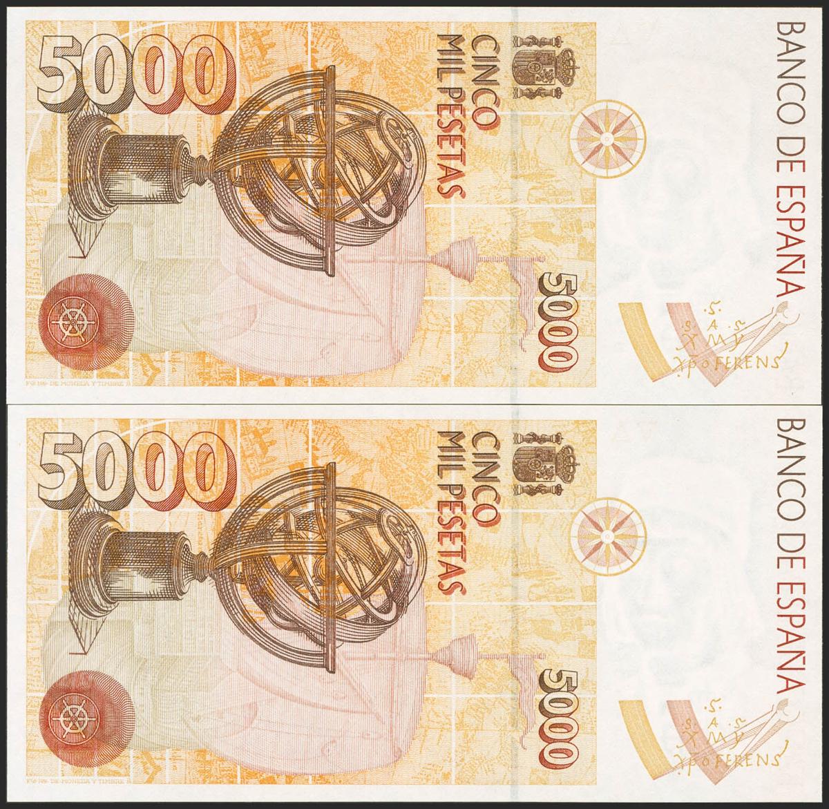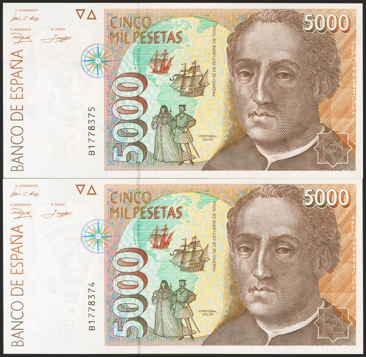 5000 Pesetas. 12 de Octubre de 1992. Pareja correlativa. Serie B. (Edifil 2021: 484a). SC.