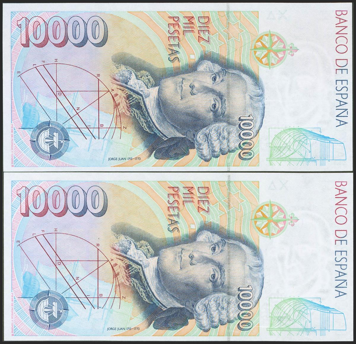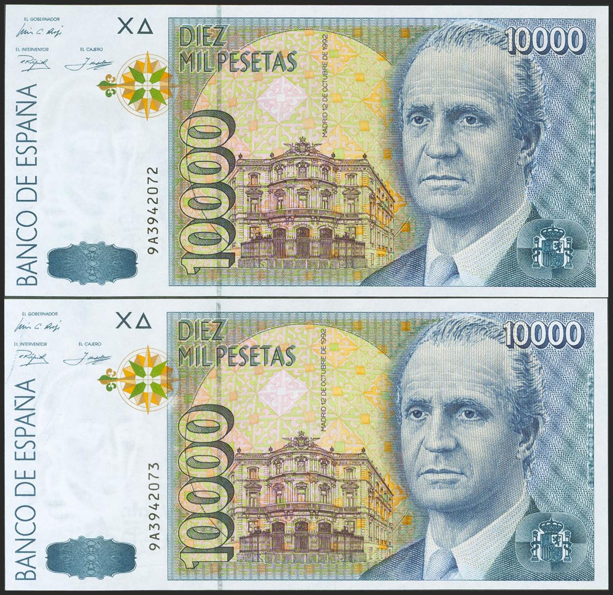 10000 Pesetas. 12 de Octubre de 1992. Pareja correlativa. Serie especial 9A. (Edifil 2017: 485b). Ondulación natural del proceso de fabricación (este es el único motivo de "quitarle" el SC). EBC+.