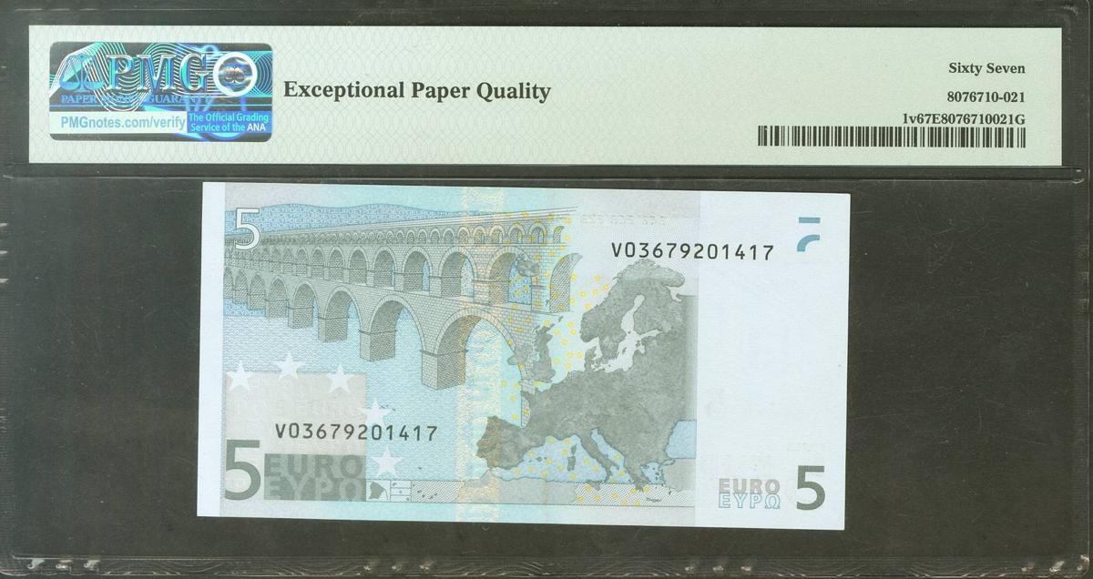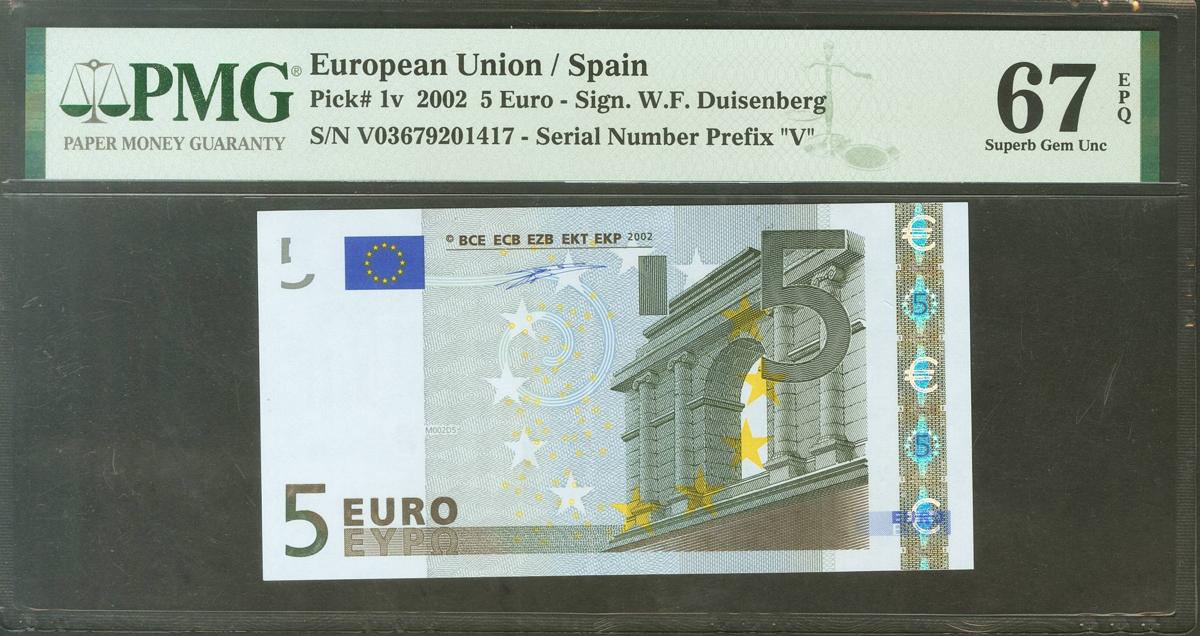 5 Euros. 1 de Enero de 2002. Firma Duisenberg. Serie V (España). (Edifil 2021: 486, Pick: 1v). Apresto original. SC. Encapsulado PMG67EPQ.