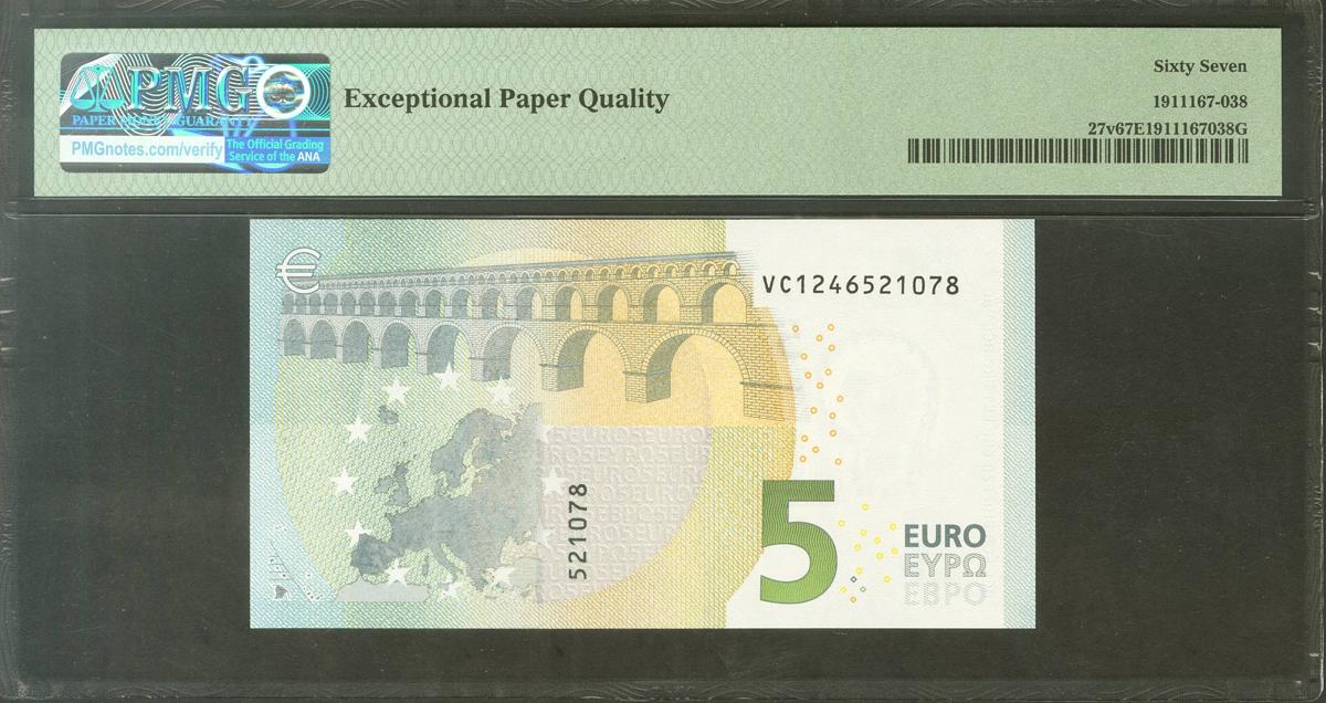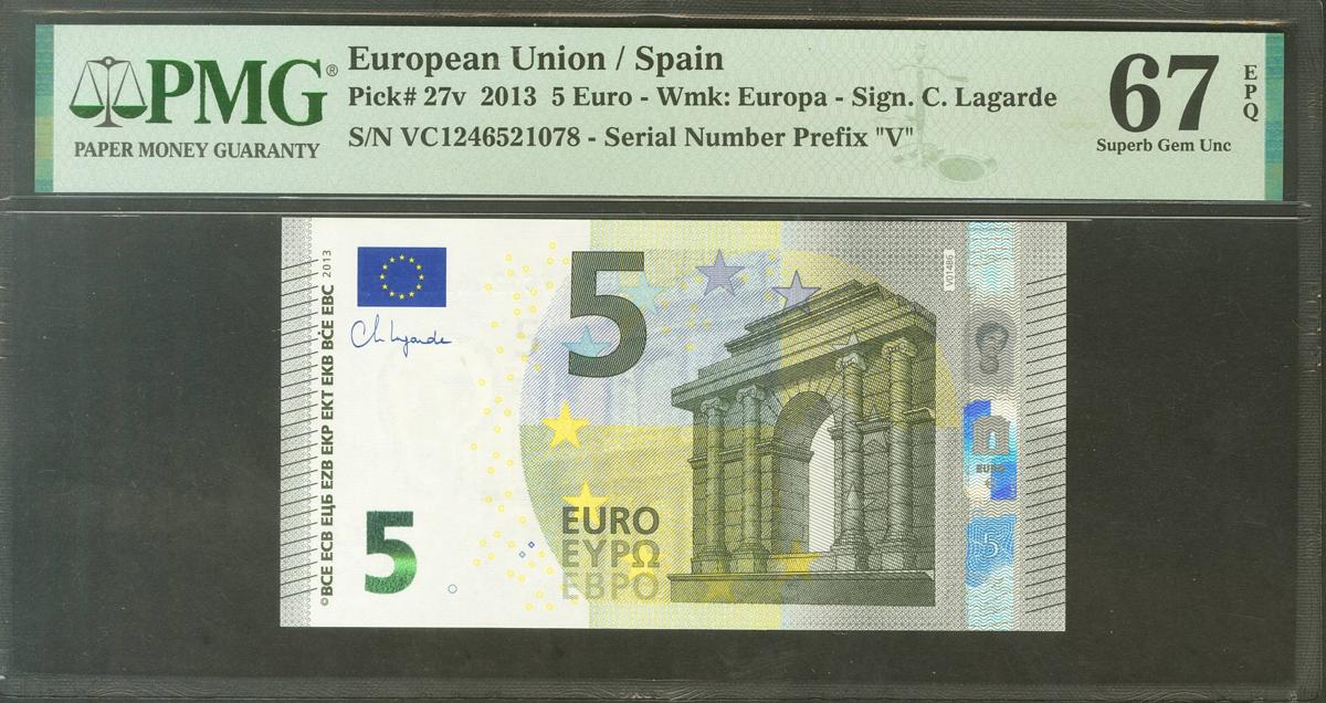 5 Euros. 2 de Mayo de 2013. Firma Lagarde. Serie V (España). (Edifil 2021: 493A, Pick: 27v). Apresto original. SC. Encapsulado PMG67EPQ.