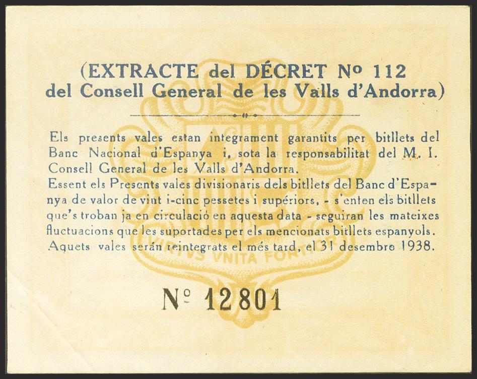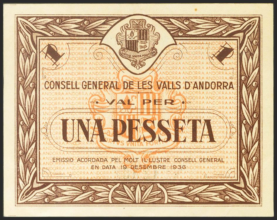 ANDORRA. 1 Peseta. 19 de Diciembre de 1936. Sin serie. (Edifil 2021: 3). EBC+.