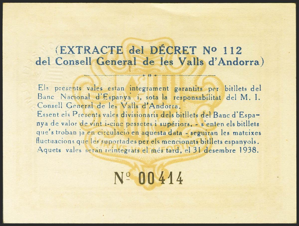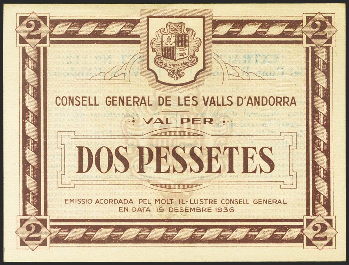 ANDORRA. 2 Pesetas. 19 de Diciembre de 1936. Sin serie y numeración muy baja. (Edifil 2021: 5). SC-.