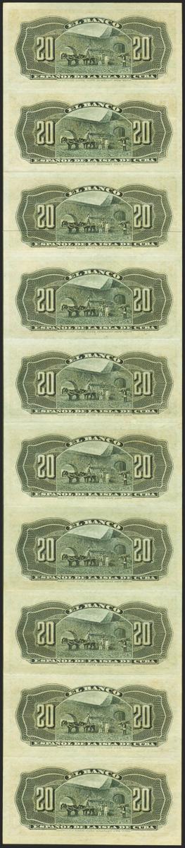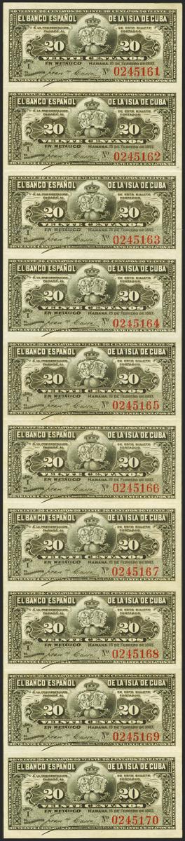 BANCO ESPAÑOL DE LA ISLA DE CUBA. 20 Centavos. 15 de Febrero de 1897. Serie I. (Edifil 2017: 85). Pliego completo de 10 billetes. Inusual. SC/SC-.
