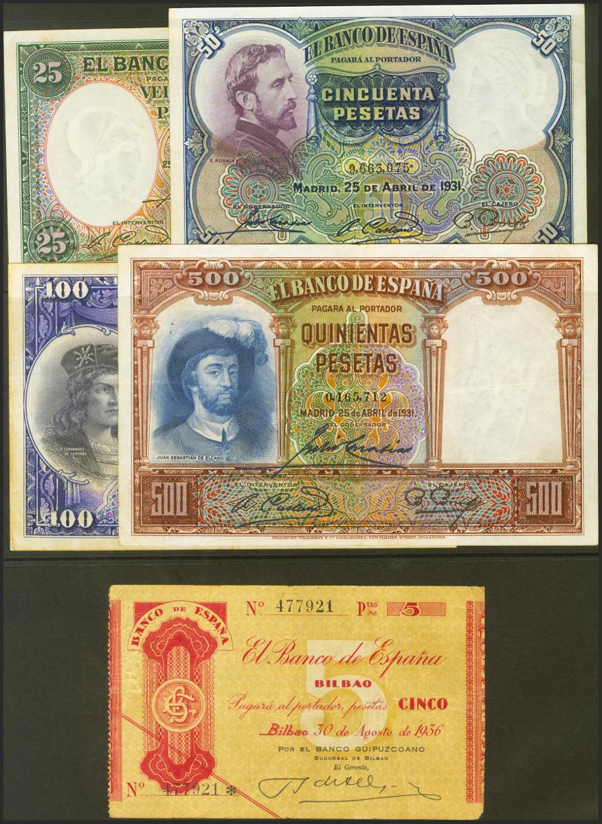 Conjunto de 5 billetes del Banco de España de diferentes emisiones y en diversas calidades. A EXAMINAR.