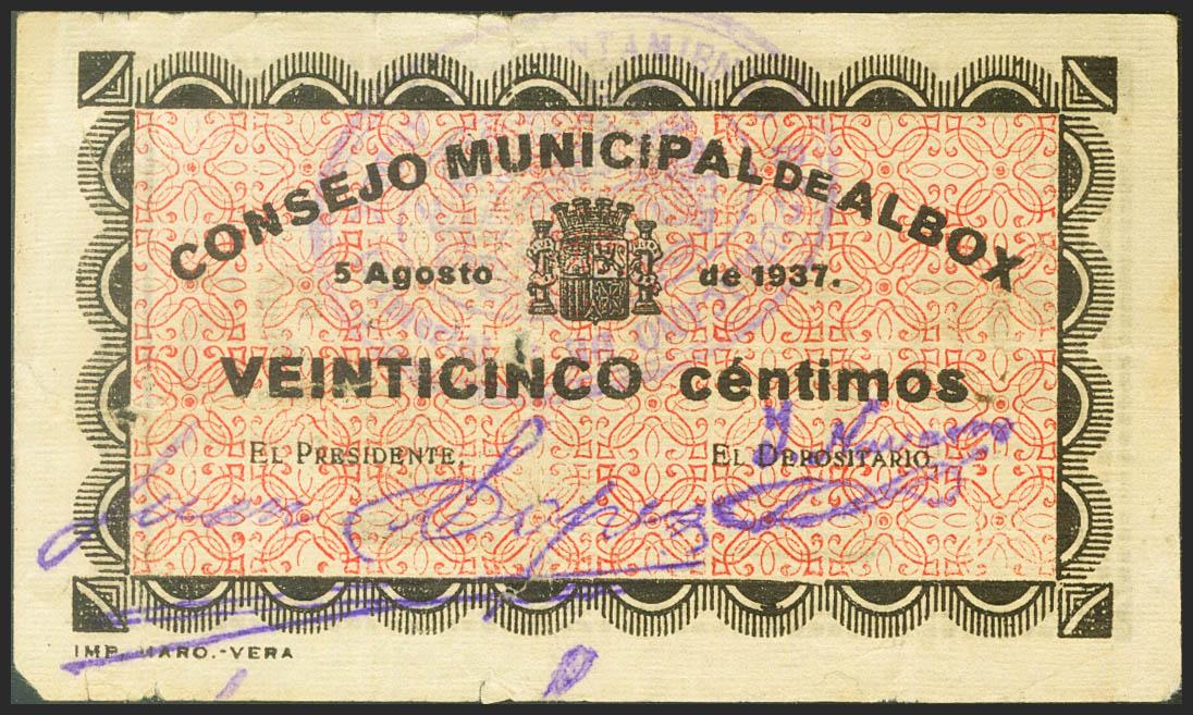 ALBOX (ALMERIA). 25 Céntimos. 5 de Agosto de 1938. (González: 238). RC.