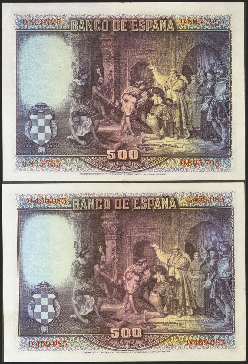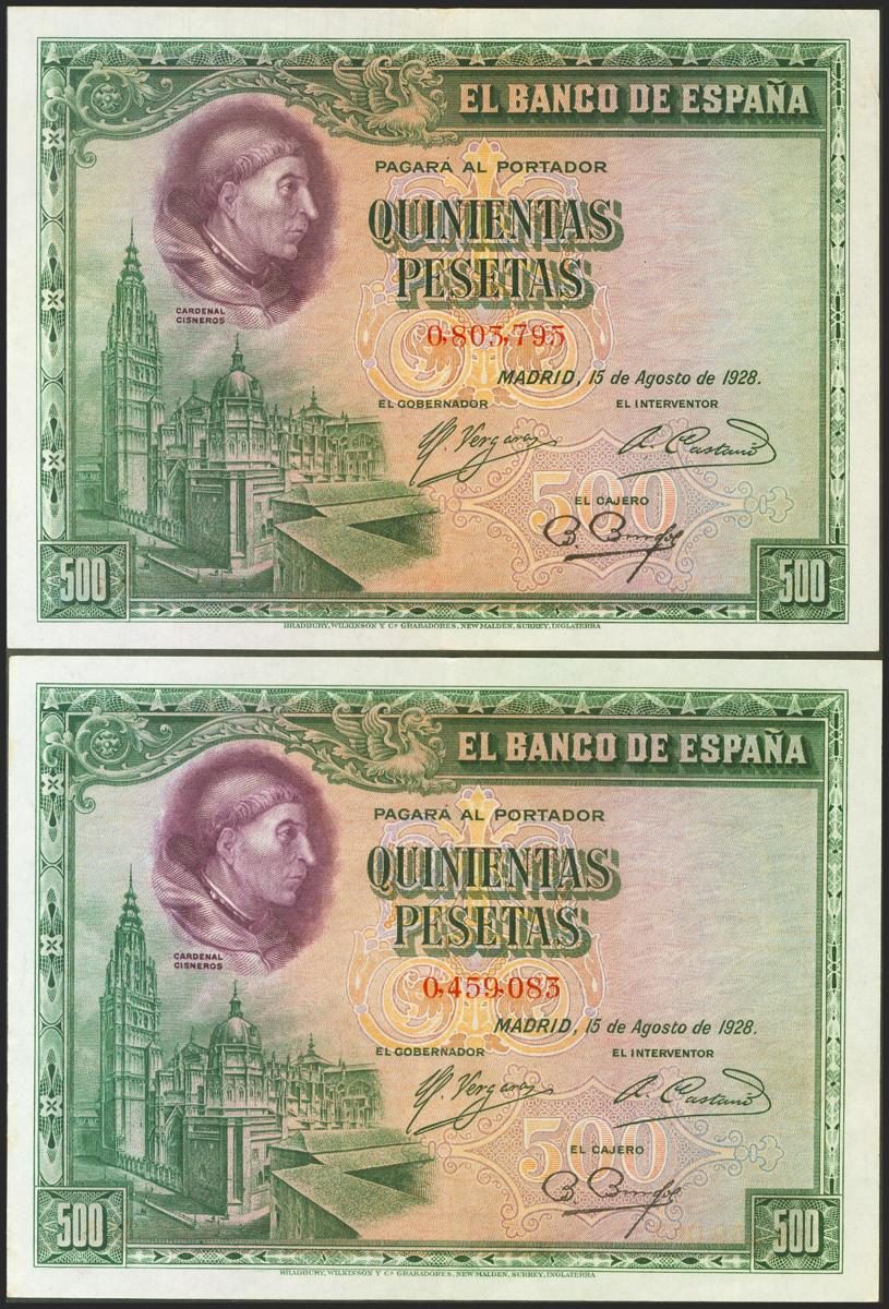 Conjunto de 2 billetes de 500 Pesetas emitidos el 15 de Agosto de 1928, sin serie. (Edifil 2021: 356). EBC.