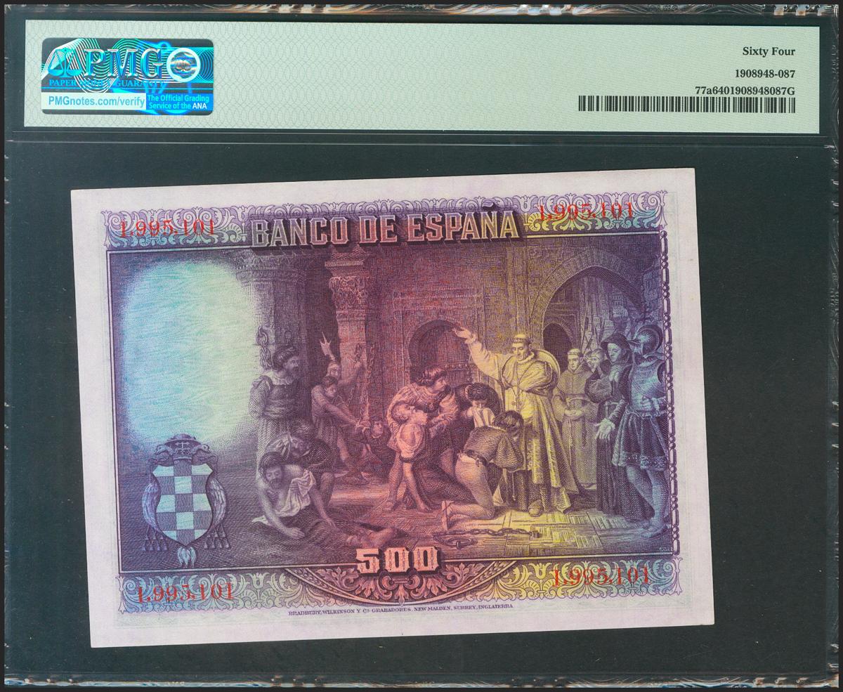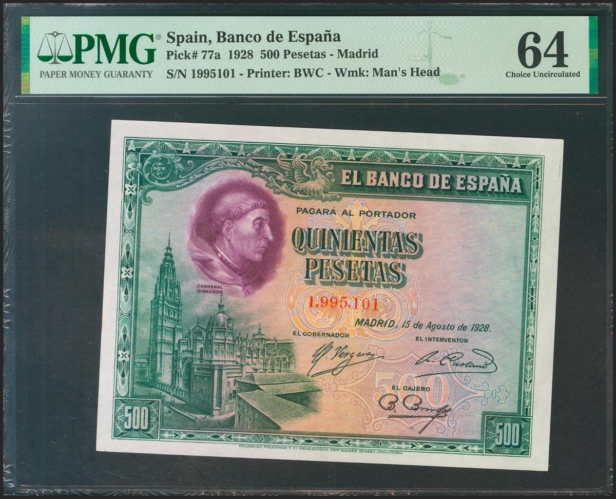 500 Pesetas. 15 de Agosto de 1928. Sin serie. (Edifil 2021: 356, Pick: 77a). SC. Encapsulado PMG64.