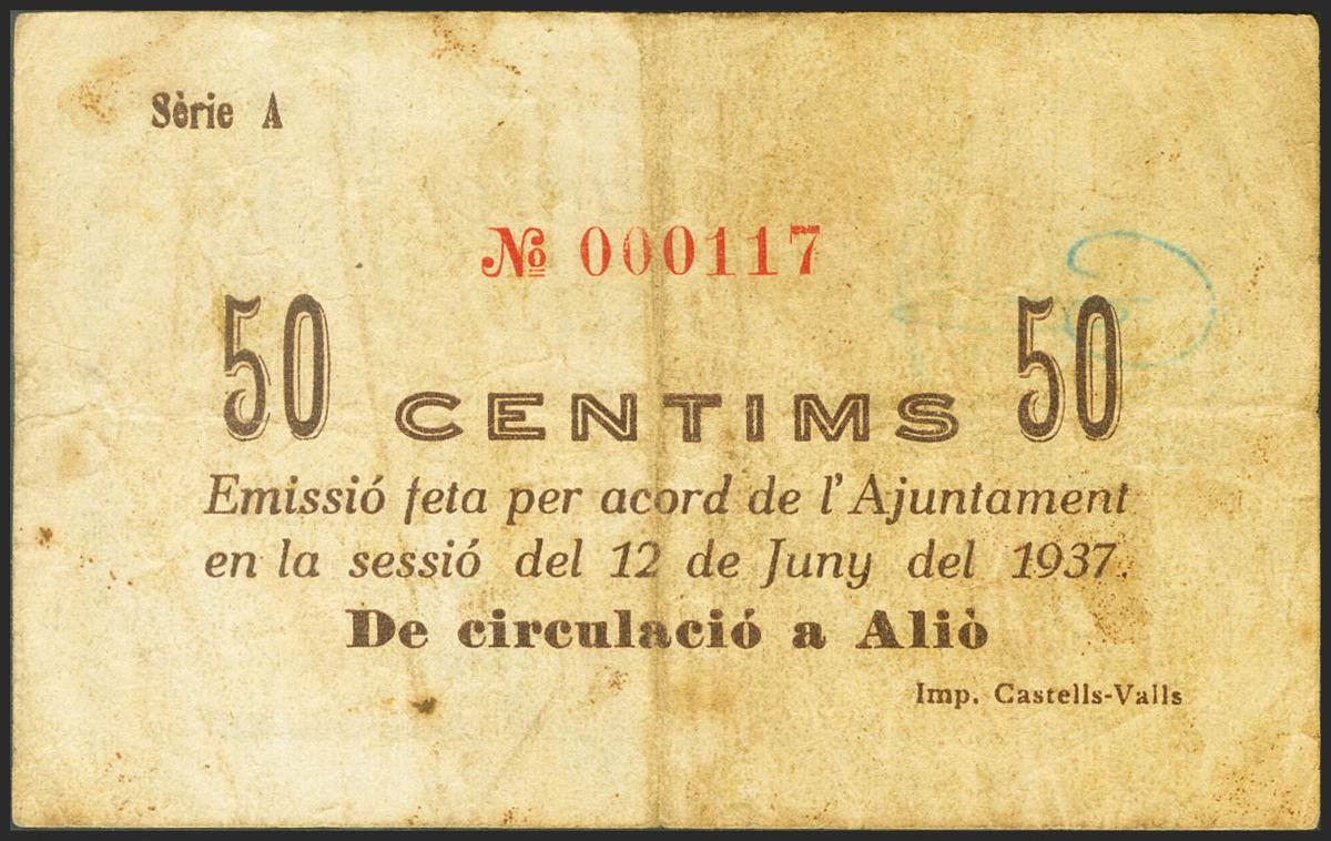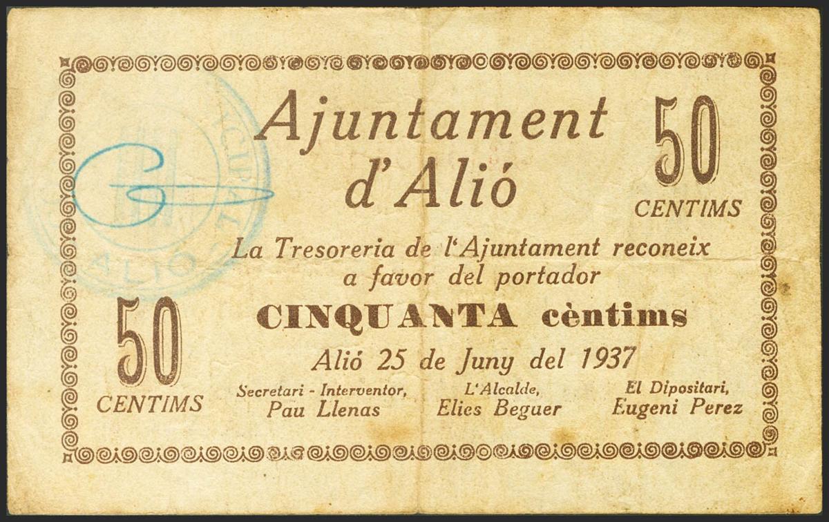 ALIO (TARRAGONA). 50 Céntimos. 25 de Junio de 1937. Serie A. (González: 6201). Raro. MBC-.