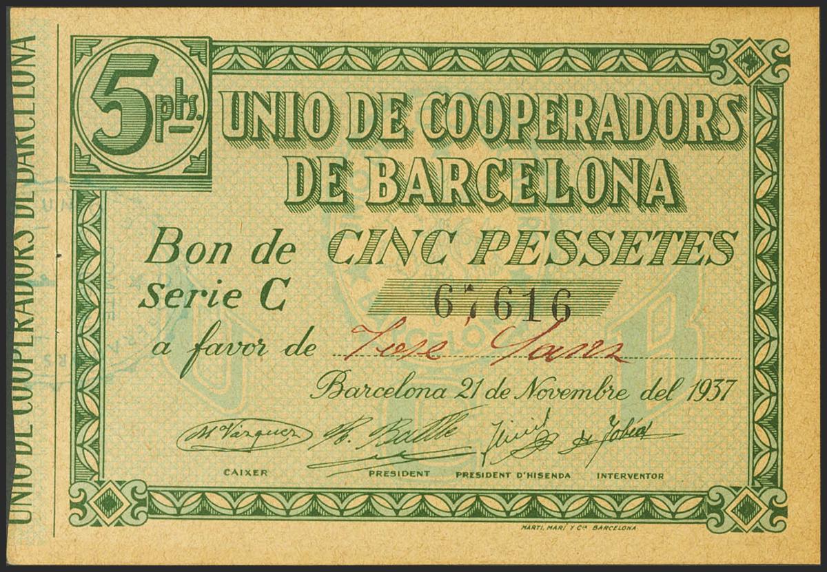 BARCELONA. 5 Pesetas. 21 de Noviembre de 1937. Serie C. (González: 6886). EBC+.