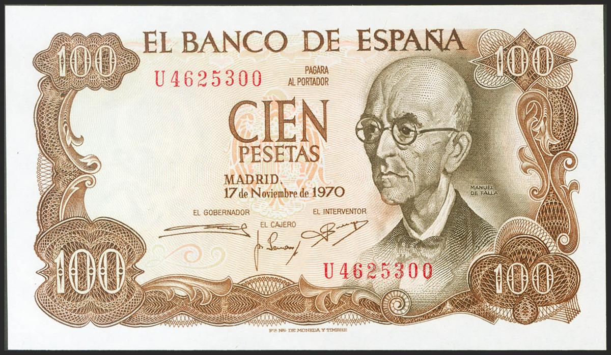 100 Pesetas. 17 de Noviembre de 1970. Serie U. (Edifil 2017: 472b). Conserva todo su apresto original. SC-.