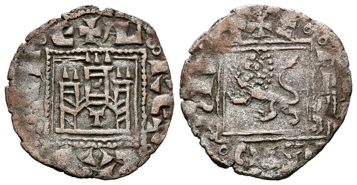 ALFONSO XI (1312-1350). Noven. (Ve. 0,84g/18mm). Toledo. (FAB-359.1). Anv: Castillo con T en la puerta, todo dentro de gráfila cuadrada, alrededor leyenda: ALF REX CASTELLE. Rev: León rampante a izquierda, delante rodela, alrededor leyenda: ET LEGIONIS. MBC.