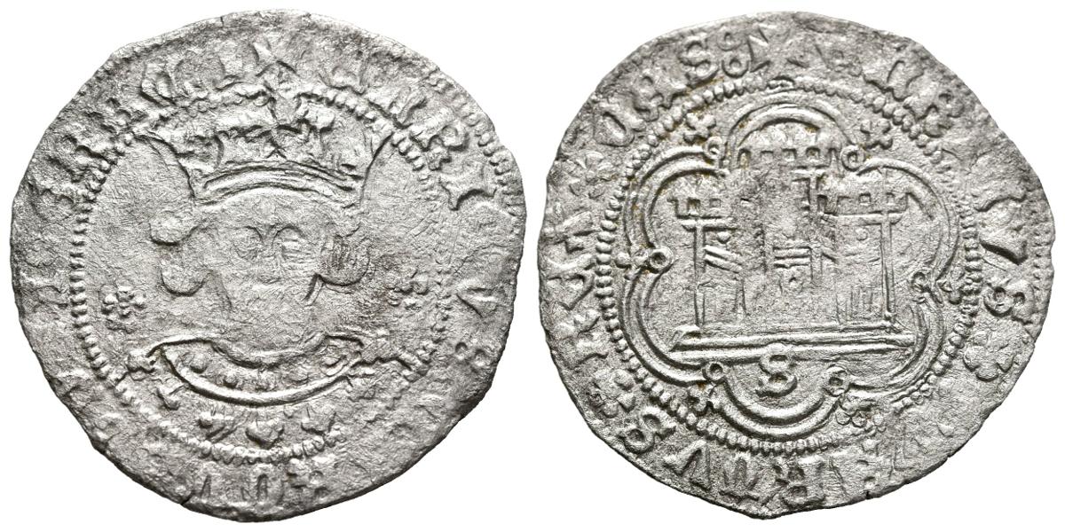ENRIQUE IV (1454-1474). Cuartillo. (Ve. 2,51g/26mm). Sevilla. (FAB-755.6). Anv: Busto coronado de Enrique IV de frente entre dos flores dentro de gráfila circular, alrededor leyenda: ENRICVS DEI GRACIA REX. Rev: Castillo, debajo S, alrededor leyenda: ENRICVS DEI GRACIA REX. MBC-. Vellón rico.