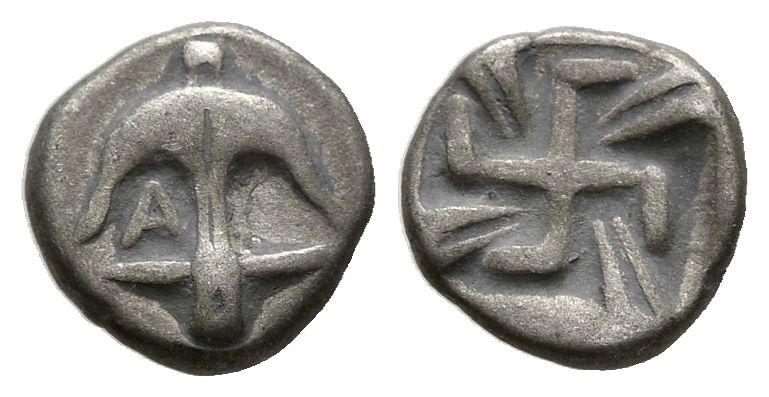 TRACIA, Apolonia Pontica. Obolo. (Ar. 0,21g/6mm). 494-470 a.C. (SNG Stancomb 32). Anv: Ancla con A a su derecha. Rev: Cruz con delfines en los cuadrantes. MBC-.