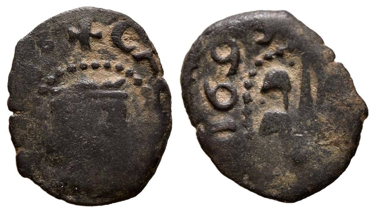 CARLOS II (1665-1700). Diner. (Ae. 0,91g/15mm). ¿1699?. Valencia. (¿Cal-2019-30?). BC+.