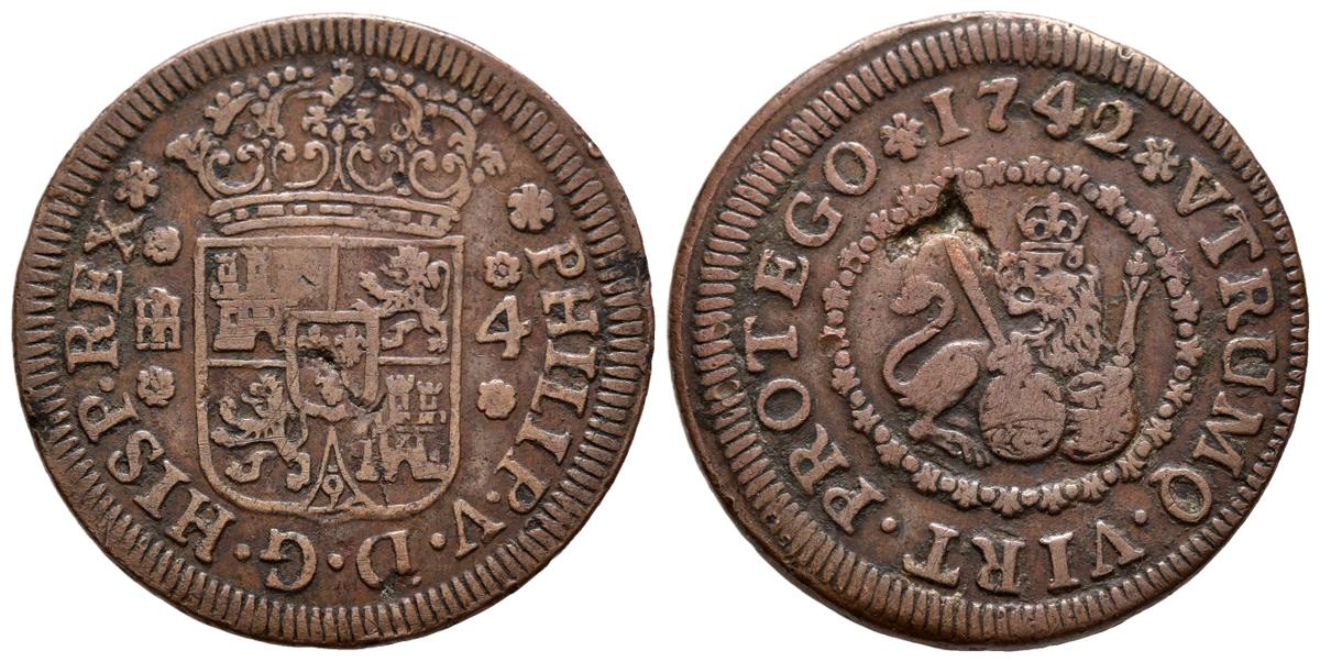 FELIPE V (1700-1746). 4 Maravedís. (Ae. 6,86g/28mm). 1742. Segovia. (Cal-2019-94). MBC. Hoja en reverso.