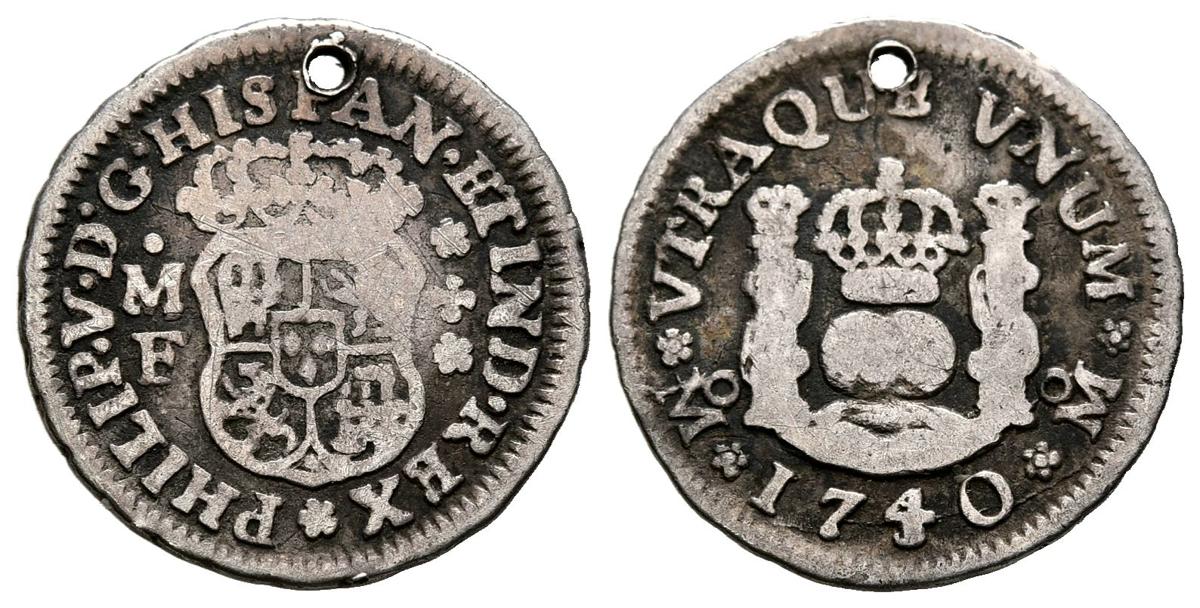 FELIPE V (1700-1746). 1/2 Real. (Ar. 1.47g /17mm). 1740. Mexico MF. (Cal-2019-264). BC+. Agujero. Escasa.