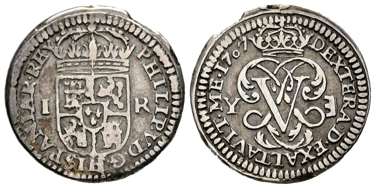 FELIPE V (1700-1746). 1 Real (Ar. 2.65g/20mm). 1707. Segovia Y. (Cal-2019-621). Cero de la fecha pequeño. MBC+.