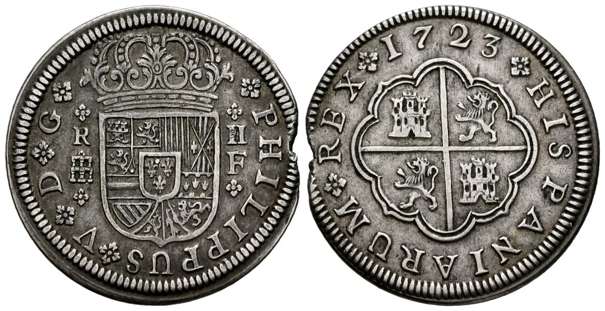 FELIPE V (1700-1746). 2 Reales. (Ar. 5,75g / 27mm). 1723. Segovia F. (Cal-2019-958). MBC+. Muesca en el canto.