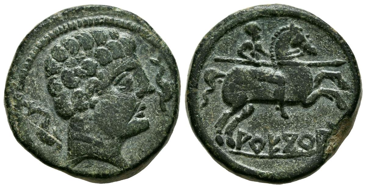 ARECORATAS (Agreda, Soria). As. (Ae. 11,75g/24mm). 150-20 a.C. (FAB-116). Anv: Cabeza masculina a derecha, entre dos delfines. Rev: Jinete con lanza a derecha, debajo leyenda ibérica: ARECoATaS. MBC+.