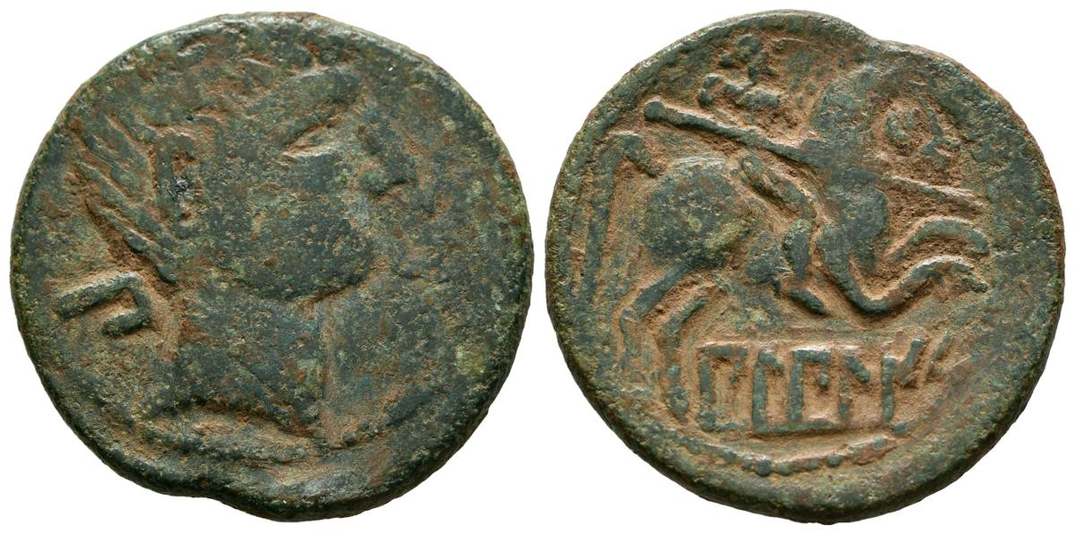 BILBILIS (Calatayud, Zaragoza). As. (Ae. 11,47g/28mm). 120-30 a.C. (FAB-258). Anv: Cabeza masculina a derecha con adornos en el cuello, detrás letra ibérica: Bi, delante delfín. Rev: Jinete con lanza a derecha, debajo leyenda ibérica: BiLBiLIS. MBC-.