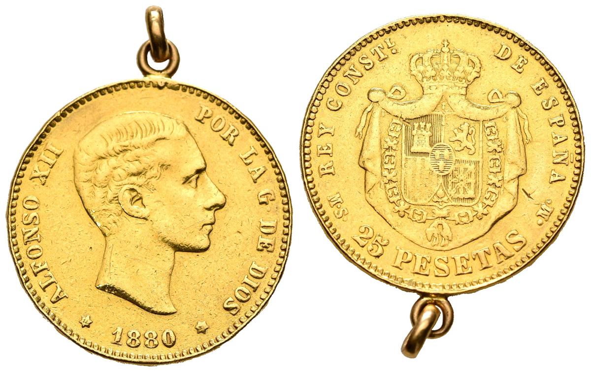 ALFONSO XII (1874-1885). 25 Pesetas. (Au. 8,22g/24mm). 1880 *18-80. Madrid MSM. (Cal-2019-79). MBC-. Usada como joya.