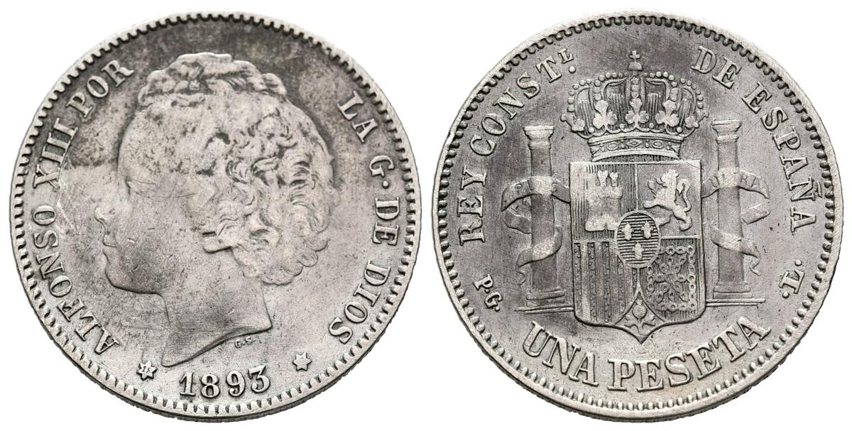 ALFONSO XIII (1885-1931). 1 Peseta. (Ar. 4,94g/23mm). 1893 *18-93. Madrid PGL. (Cal-2019-54). MBC-. Primera estrella sólo visible.