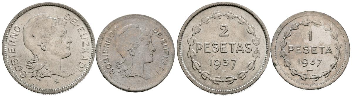 GUERRA CIVIL (1936-1939). Pareja de 1 y 2 Pesetas del Gobierno de Euzkadi acuñadas en 1937. (Cal-2019-14/15). EBC+. A EXAMINAR.