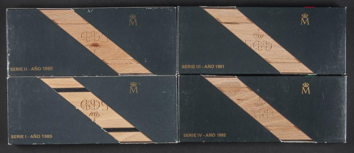 JUAN CARLOS I (1795-2014). Serie de 4 estuches de la Colección de 5 Valores en plata del Quinto Centenario (Series I a IV). 1989-1992. FNMT. Monedas en plata con valores comprendidos entre 100 y 2000 Pesetas. FDC (mate y brillo). Incluye estuches originales y certificados de autenticidad.