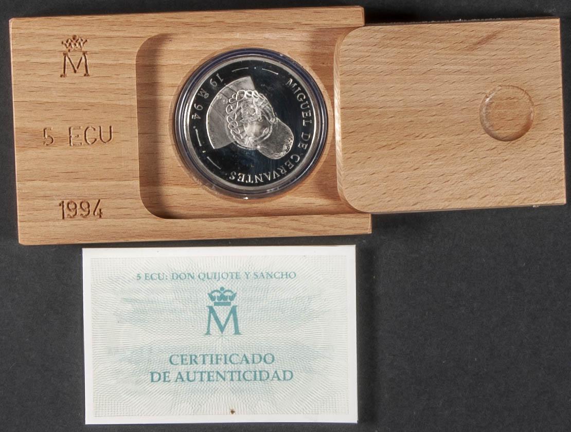 JUAN CARLOS I (1975-2014). 5 Ecu. (Ar. 33,62g/42mm). Cervantes-Don Quijote. 1994. FNMT. FDC. Incluye estuche original y certificado de autenticidad.