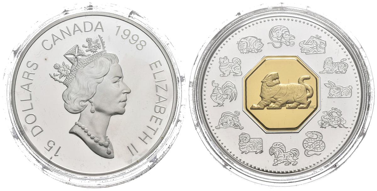 CANADÁ. 15 Dollars (Ar. 34,00g/40mm). 1998. Zodiaco Chino. Año del Tigre. (Km#304). PROOF. Incluye caja, estuche original y certificado de autenticidad.