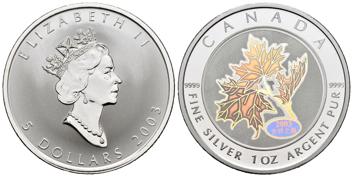 CANADÁ. 5 Dollars (Ar. 31,28g/38mm). 2003. Serie de la Buena Fortuna. Arce en Holograma. PROOF. Incluye estuche original y certificado de autenticidad.