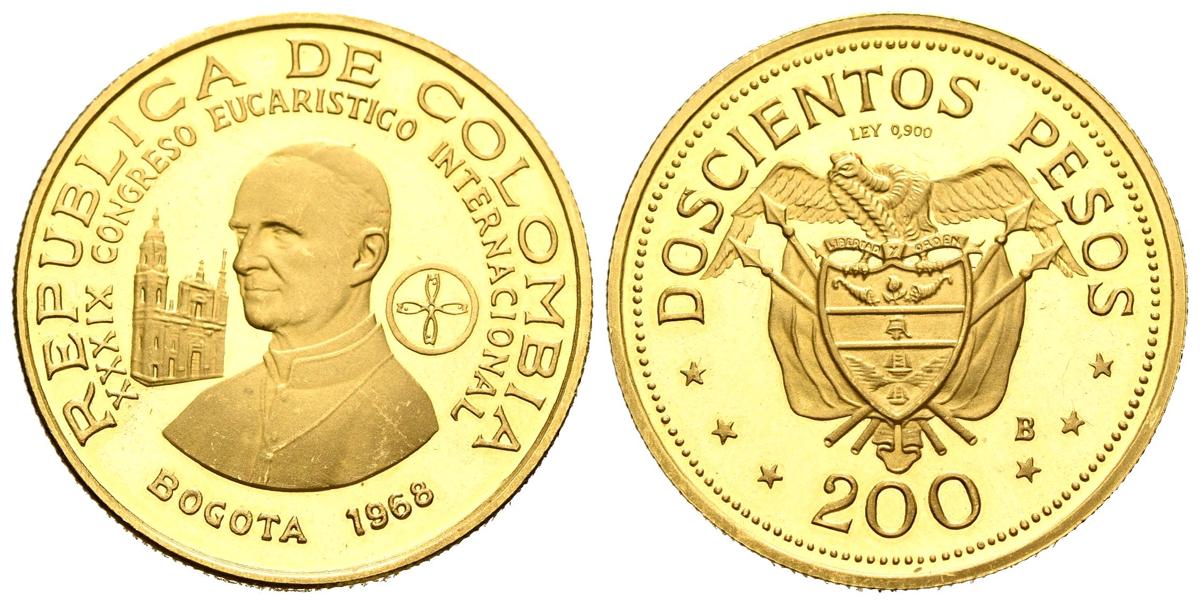 COLOMBIA. 200 pesos. (Au. 8,71g /24mm). 1968. Congreso Internacional Eucarístico de Bogotá. (Km#232). PROOF.