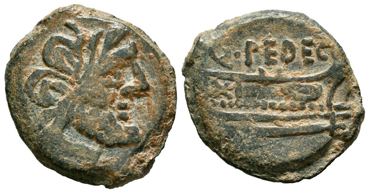 CARTEIA (San Roque, Cádiz). Semis. (Ae. 5,28g/22mm). 80-20 a.C. (ACIP 2562 var). Anv: Cabeza de Júpiter a derecha, detrás leyenda: CARTEIA. Rev: Proa a derecha, encima leyenda: Q PEDECA. MBC+.