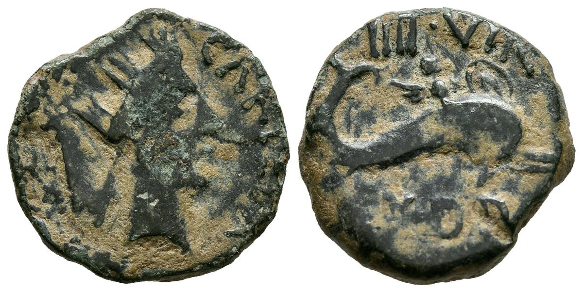 CARTEIA (San Roque, Cádiz). Semis. (Ae. 3,66g/18mm). 27 a.C.-14 d.C. (FAB-670). Anv: Cabeza femenina con corona mural a derecha, delante leyenda: CARTEIA, detrás tridente. Rev: Amorcillo sobre delfín a derecha, alrededor leyenda: IIII VIR D D. MBC-.