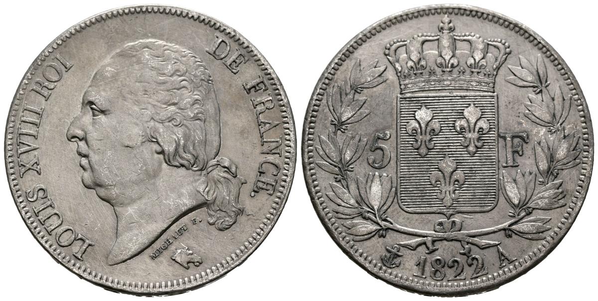 FRANCIA. 5 Francs (Ar. 24,91g/36mm). 1822. Luis XVIII. París A. (Km#711.1). MBC+.