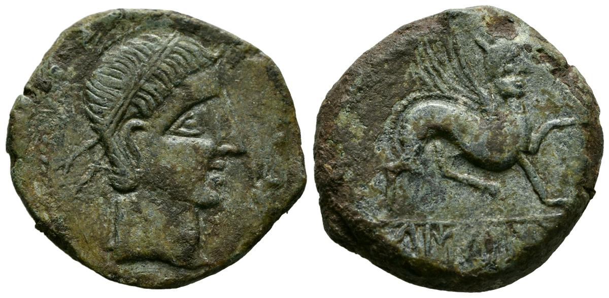 CASTULO (Cazlona, Jaén). As. (Ae. 12,23g/27mm). 180 a.C. (FAB-700). Anv: Cabeza diademada masculina a derecha, delante mano. Rev: Esfinge a derecha, debajo leyenda ibérica: CaSTeLE. MBC+.
