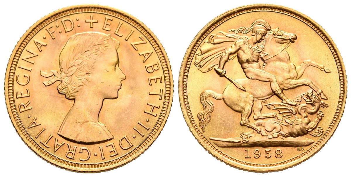 GRAN BRETAÑA. 1 Soberano (Au. 7,99g/22mm). 1958. Isabel II. (Km#908). Grabador: Benedetto Pistrucci (BP). SC-. Ligerísmas marquitas.