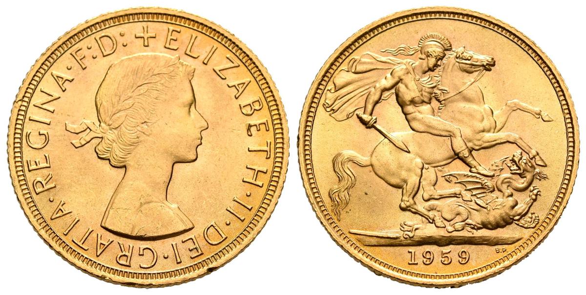 GRAN BRETAÑA. 1 Soberano (Au. 7,99g/22mm). 1959. Isabel II. (Km#908). Grabador: Benedetto Pistrucci (BP). SC-. Ligerísmas marquitas.
