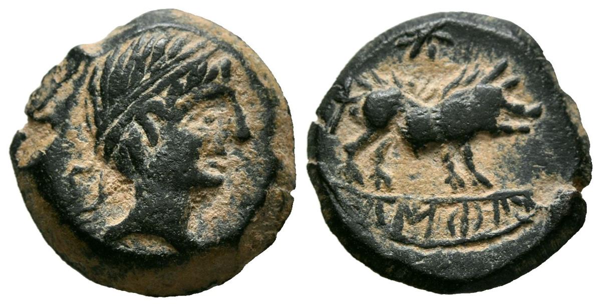 CASTULO (Cazlona, Jaén). Cuadrante. (Ae. 3,29g/15mm). 180 a.C. (FAB-736). Anv: Cabeza masculina a derecha, delante letra ibérica Ca. Rev: Jabalí a derecha, encima estrella, debajo leyenda ibérica CaSTeLE. MBC/MBC+.