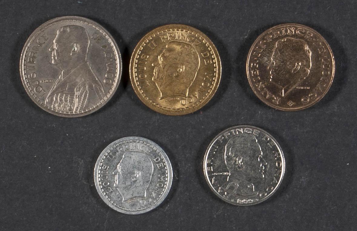 MÓNACO. Conjunto de 5 monedas acuñadas entre 1943 y 1978 y con módulos de 1, 2 y 20 Francos. Diferentes estados de conservación. A EXAMINAR.