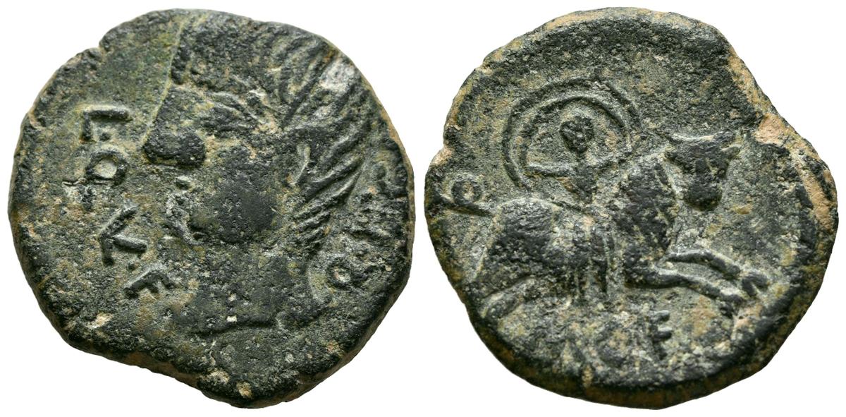 CASTULO (Cazlona, Jaén). As. (Ae. 11,79g/28mm). 180 a.C. (FAB-747). Anv: Cabeza masculina a izquierda, alrededor leyenda: L QVL F O ISC F. Rev: Rapto de Europa a derecha, debajo leyenda: MCF. MBC.