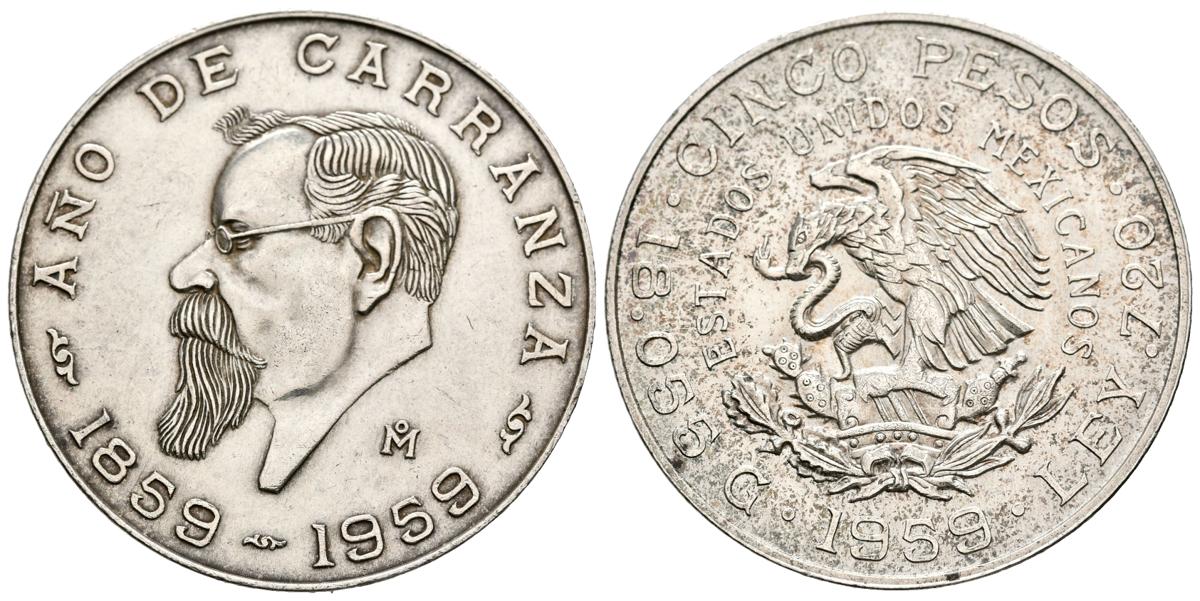 MÉXICO. 5 Pesos. (Ar. 17,96g /36mm). 1959. Año de Carranza. (Km# 471). EBC-.
