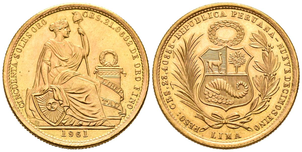 PERÚ. 50 Soles Oro (Au. 23,35g/30mm). 1961. Lima. Matrona y Escudo. (Km#230). EBC+. Soberbia pieza.