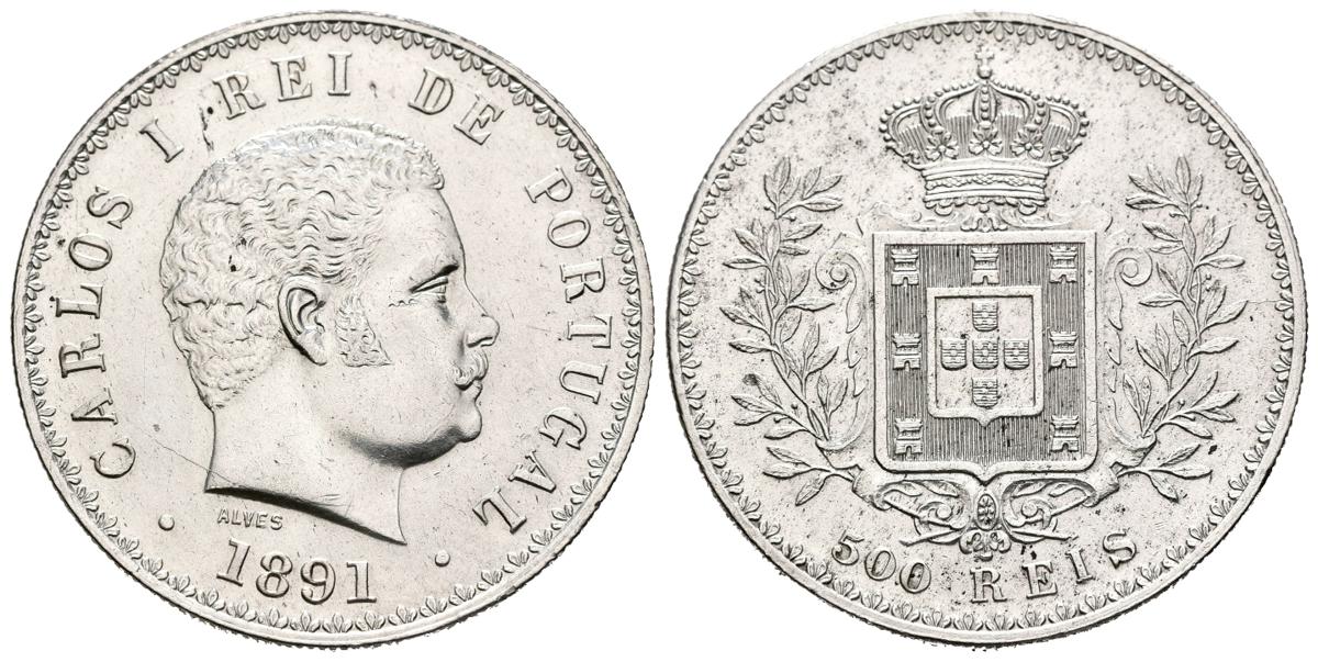 PORTUGAL. 500 Reis (Ar. 12,30g/31mm). 1891. Carlos I. (Gomes 11.01). EBC. Limpiada.