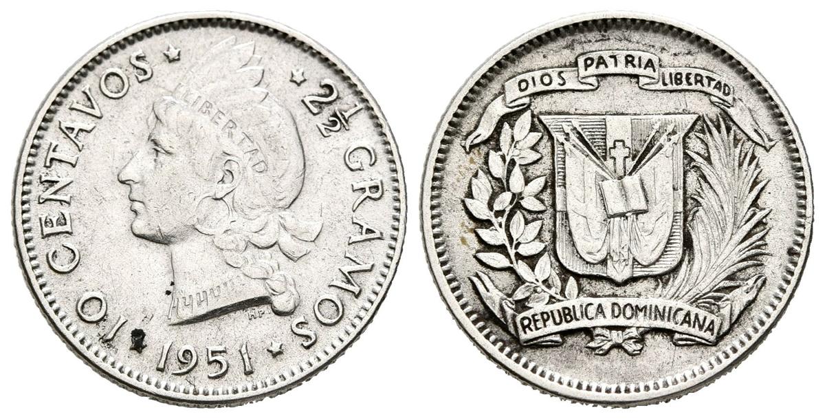 REPUBLICA DOMINICANA. 10 Centavos. (Ar. 2,51g/18mm). 1951. (Km#19). EBC. Escasa.