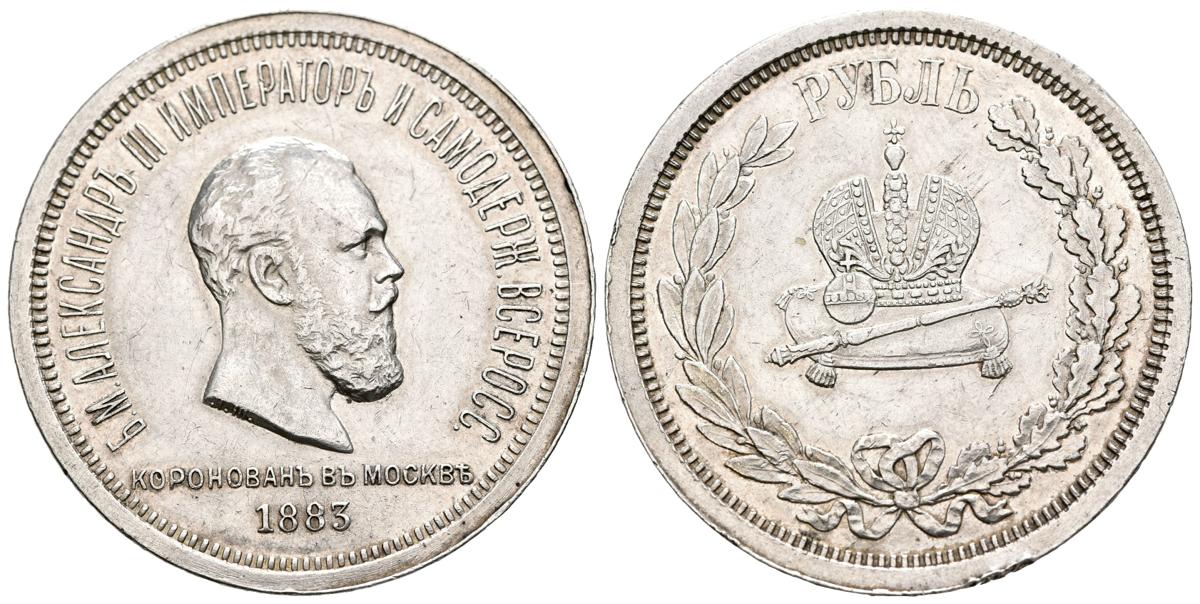RUSIA. 1 Rublo (Ar. 20,69g/35mm). 1883. Coronación de Alejandro III. (Km#43). MBC+. Escasa.